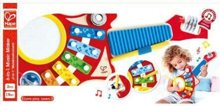 Hape 6 in 1 kitarassa on monta soitinta! Voit esimerkiksi soittaa rumpuja, tampuriinia, raaputtaa lautaa tai soittaa ksylofoonia. Ikäsuositus 18kk +.