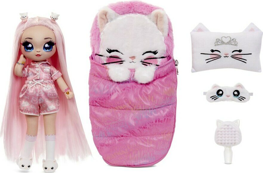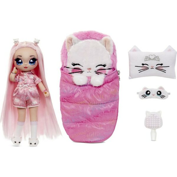 Na! Na! Na! Surprise Teens Mila Rose Pyjamaparty. Figuurinukke, vaaleanpunaisilla hiuksilla ja söpöllä pyjamalla. Pakkaukseen kuuluu vaaleanpunainen makuupussi, tyyny, unimaski, kissatohvelit ja hiusharja nukelle. Ikäsuositus 3+.