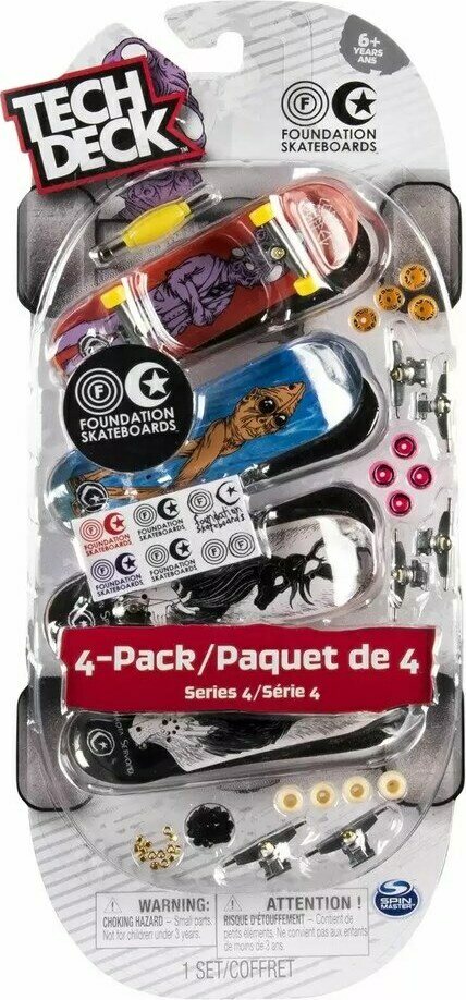 Tech Deckin pakkaus, jossa mukana 4 lautaa ja muita sormiskeittitarvikkeita kuten tarroja ja ruuveja. Ikäsuositus: 6+ vuotta