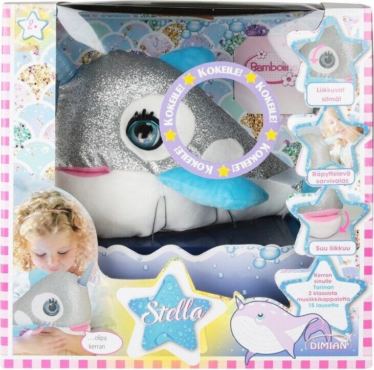 Tuotteen kuvausStella-valas on monipuolinen ja ihana lelu, kuin pieni ystävä. Sen vatsaosa on valkoinen, evät vaaleansiniset ja sen yläosa on säihkyvän hopeinen. Stellalla on suuriet, siniset liikkuvat silmät, joita se räpsyttelee. Kun Stella kertoo Pieni Merenneito -satua, sen suu liikkuu. Lisäksi Stella soittaa kaksi klassista kappaletta. Ihastuttava, säihkyvä ja pehmeä toiminnallinen pehmolelu. Lempeisiin hetkiin!
