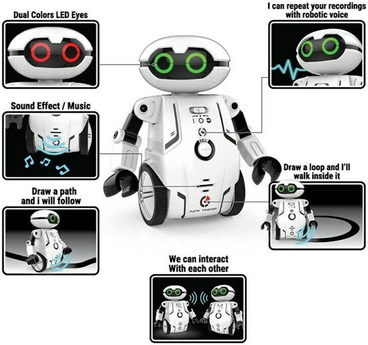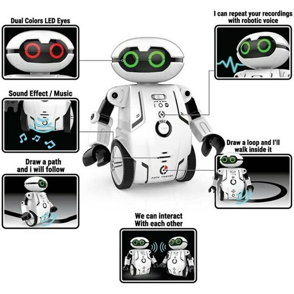 Piirrä viiva niin hän seuraa. Piirrä ympyrä niin hän pyörii sen sisällä. Hän selvittää mukana tulevan labyrintin. Äänittää roboottiäänellä. Voidaan kytkeä toimimaan yhdessä muiden Silver Lit roboottejen kanssa. Exstrana appi. Paino 0,200 kg Koko: 9 x 12 x 6 cm Paristotarve 2xAAA (ei sis) Leikkiaika. n 45min