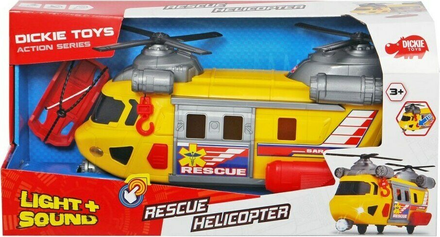 Pelastushelikopterissa on äänet ja valot. Pakkauksessa tulee mukana paarit, jotka voi kiinnittää helikopterin koukkuun. Helikopterin katolla kaksi ropellia. Helikopterin oven saa vedettyä auki.