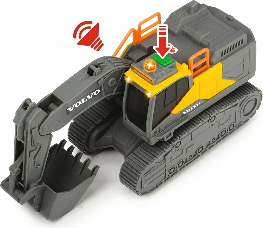 ? Ääni- ja valotoiminnoilla varusteltu kaivinkone. ? Pituus 23 cm. ? Vapaasti pyörivät pyörät. ? Paristontarve: 2 x LR44 (sisältyvät). ? Ikäsuositus 3+ vuotta.