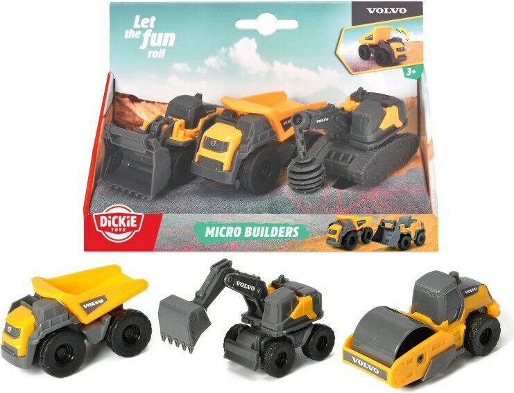 Dickie Toys Volvo Micro Builders setti sisältää 3 Volvo työkonetta. Mukana tulee lavakuorma-auto, höyryjyrä sekä kaivinkone TAI purkukuula työkone. Ajoneuvot ovat n. 90 cm kokoisia. 3+ vuotiaille