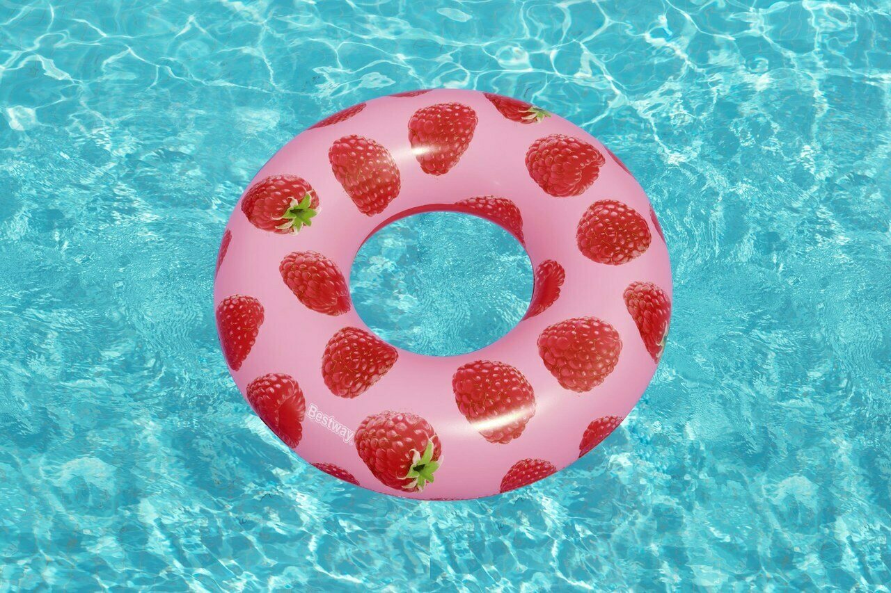 Uimarengas tuoksuu vadelmalta, mutta ei liian voimakkaasti. Trendikäs ja realistinen vadelmakuviointi. Halkaisija 119 cm. Mukana korjauspaikka. Ikäsuositus 12+. HUOM! Viimeinen myyntikappale on ollut mallina myymälässä.