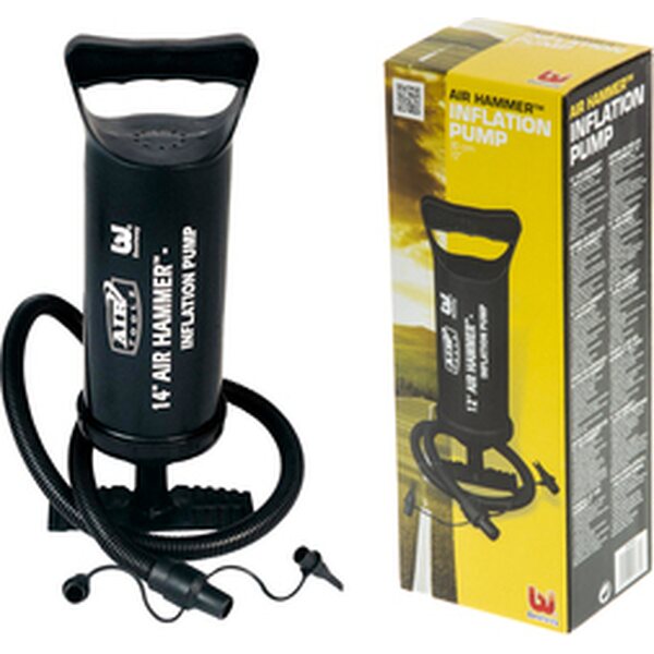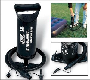 Uimaleluihin soveltuva käsikäyttöinen pumppu, jossa 3 erilaista suutinta.