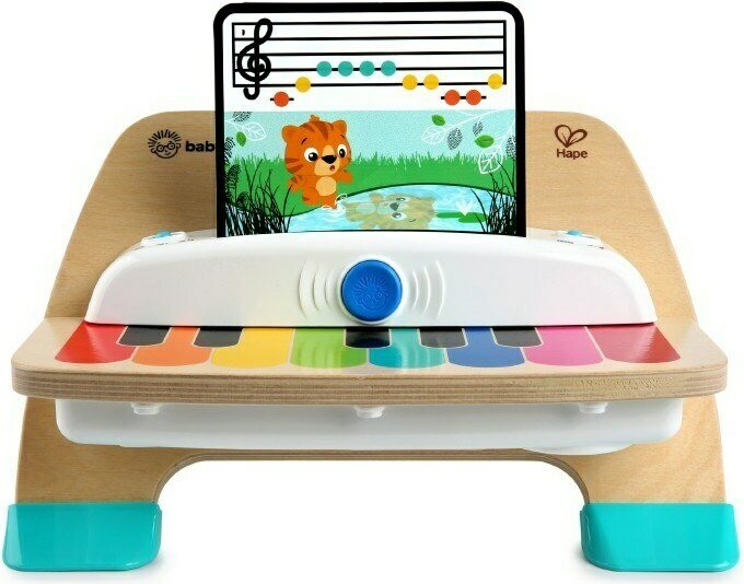 Tuotteen kuvausUpea ensipiano, jonka pehmeä ääni muistuttaa oikean pianon sointia. Taikakoskettimilla olevan pianon äänenvoimakkuus on säädettävissä. Painamalla sinistä Einstein-nappia voi kuunnella valmiita musiikkikappaleita ja niiden päälle pystyy soittamaan omia melodioita. Paketti sisältää väreillä merkityt mallinuotit kuuteen eri sävelmään. Taaperon on helppo soittaa ensisäveliä näiden värikoodien avulla. Pakkaus sisältää testikäyttöön tarkoitetut 3x AA paristot, jotka ovat vaihdettavissa. Materiaali: puu, muovi. Tuotteen koko: 31x16x23 cm. Paketin koko: 33x19x27 cm. Ikäsuositus: 1+.