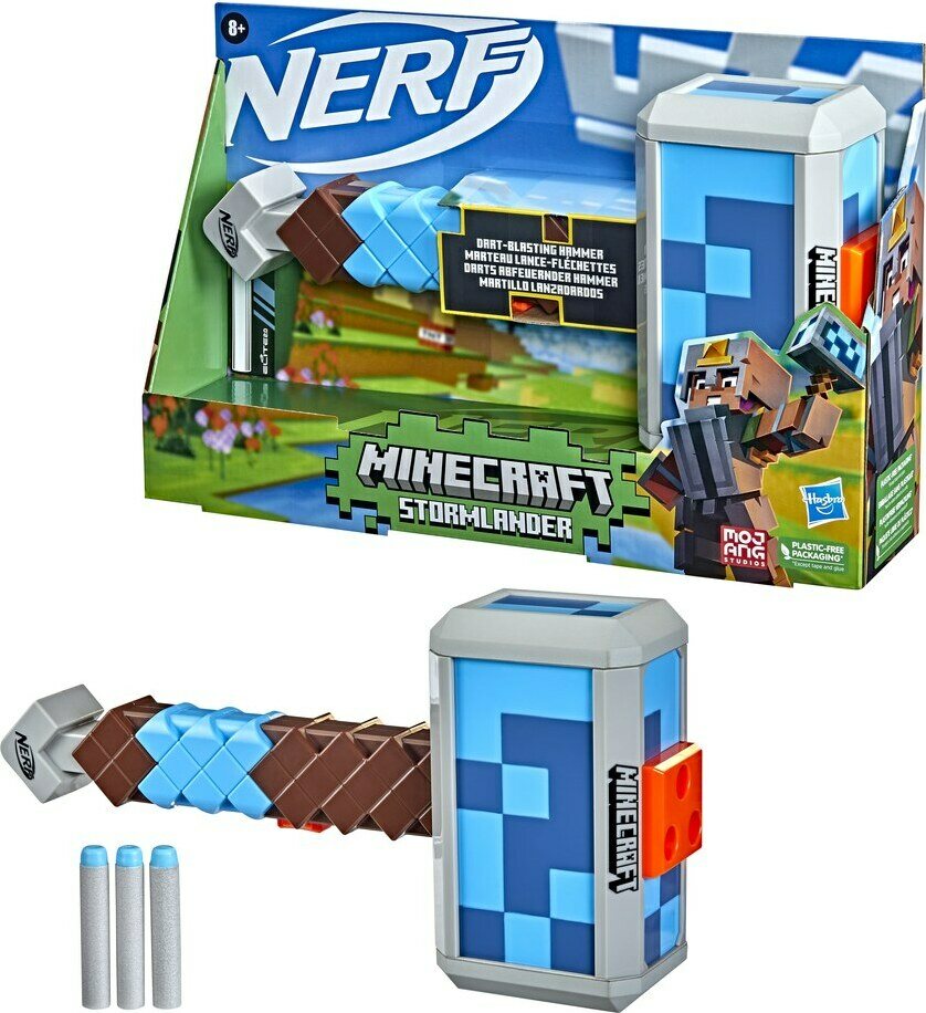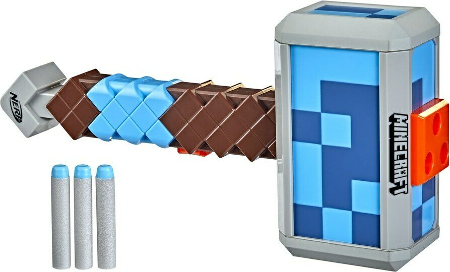 Tämä nuolia ampuva Nerf Minecraft ?vasara on Minecraft: Dungeons ?pelin vasaran innoittama. Kolmen nuolen kapasiteetti. Ikäsuositus 8+.
