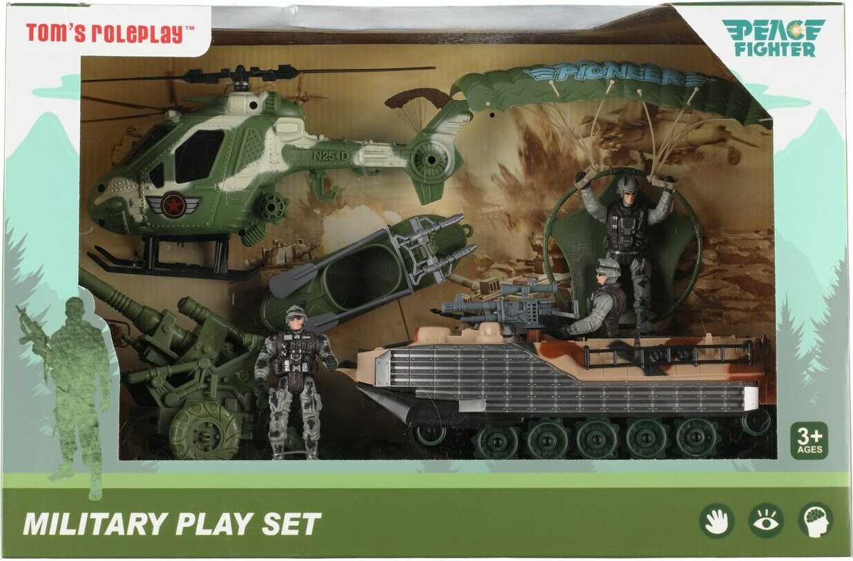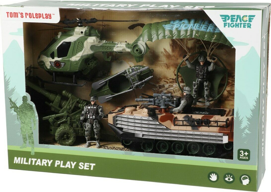 Setissä helikopteri, lakuvarjohyppääjä ja laskuvarjo, tykki, tankki ja yksi figuuri. Ikäsuositus 3+.