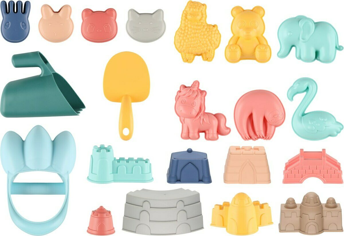 Setissä 20 osaa mm. eläimenmuotoisia muotteja, hiekkakannu. Ikäsuositus 18 kk+.