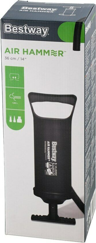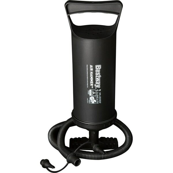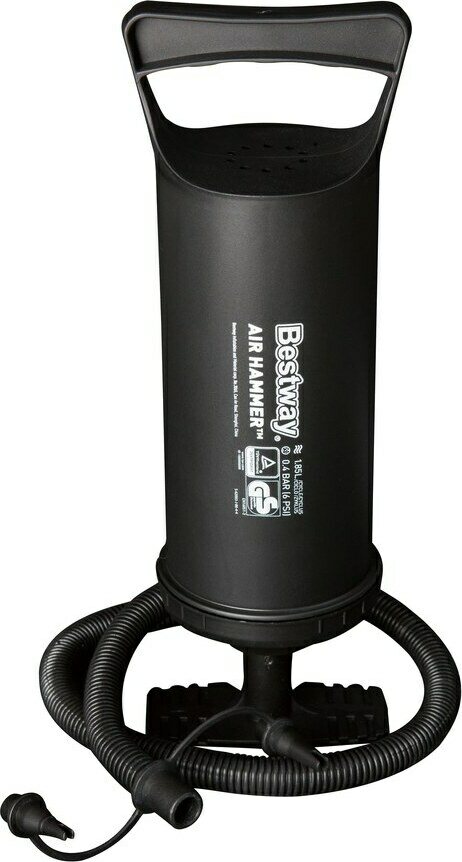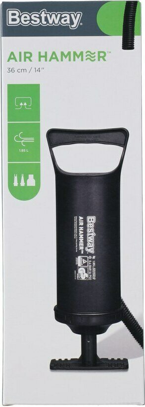 Käsikäyttöinen ilmapumppu. Iskutilavuus 1,85 l /sykli. 0.4 BAR (6 PSI). Taipuisa letku. 3 erikokoista sovitinta, käy lähes jokaiseen täyttöventtiiliin. Kevyt käyttää, täyttää sekä ylös- että alaspäin pumpatessa. Tehokas.