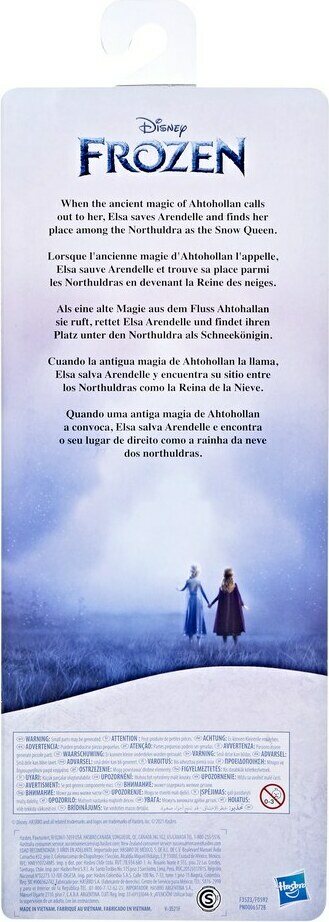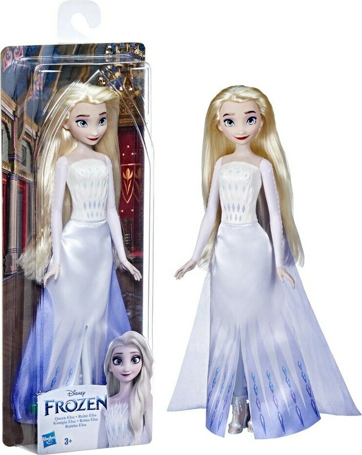 Elsa-nukella on Frozen 2 -elokuvan loppukohtauksen innoittamat irrotetavat vaatteet - valkoinen hame ja jäänsininen viitta geometrisllä kuvioilla. 28 cm nukella on valettu yläosa, vaaleat pitkät hiukset ja viisi nivelpistettä.