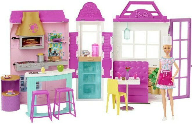 Tervetuloa Barbien ravintolaan, jossa valmistat ja tarjoilet herkulliset ateriat ystävillesi. Ravintolassa on pyörivä grilli, väriävaihtava pizza ja paljon muita tarvikkeita. Ravintola taittuu helposti mukaan. Barbie sis. pakkaukseen. Ikäsuositus 3+.