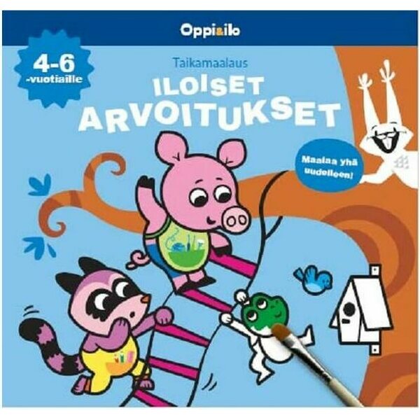 Oppi&ilo Iloiset arvoitukset -taikamaalauskirjan kuvat voi maalata aina uudelleen ja uudelleen. Vesi tuo värit näkyviin ja kuivuttuaan värit häviävät. Kirja sisältää hauskoja arvoituksia: päättele vastaus sivun kysymykseen maalattuasi värit ja yksityiskohdat ensin näkyviin! Tämä taikamaalauskirja sopii leikki-ikäisille ja vähän isommillekin puuhastelijoille.