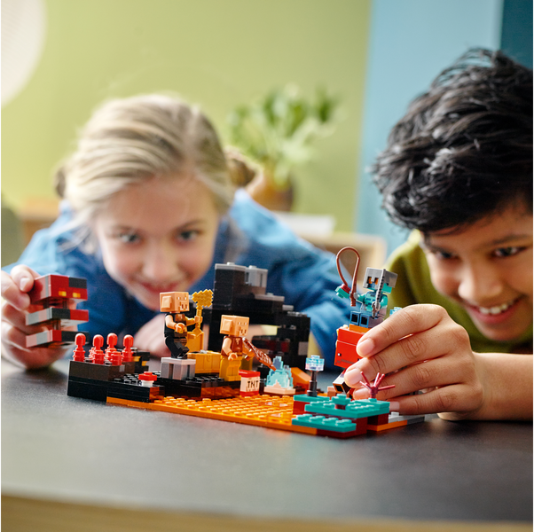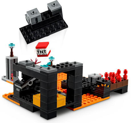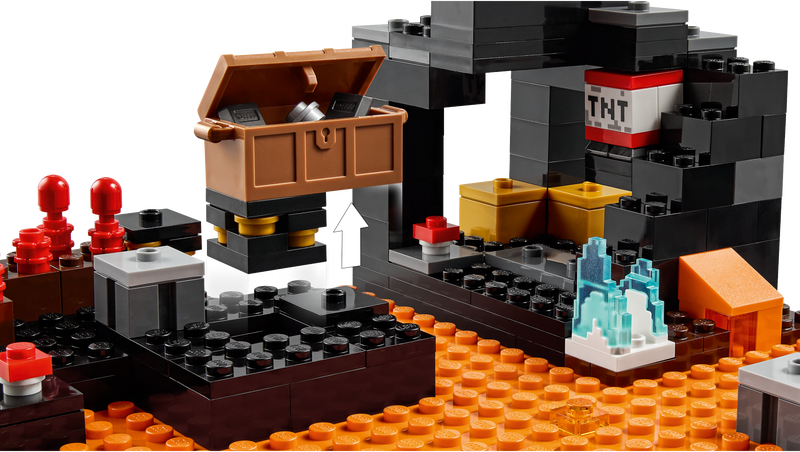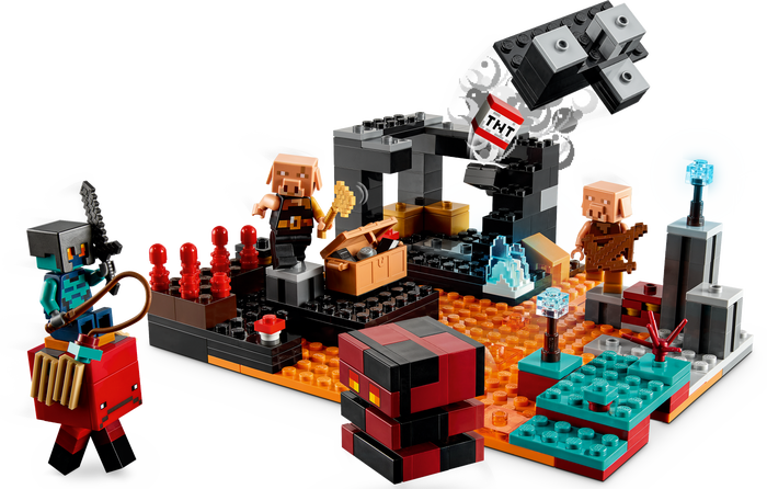 Pelaajien tehtävänä on taistella tiensä hurjaan Netherin linnoitukseen ja suorittaa monia haasteita, joissa jokainen kerätty esine avaa oven uusiin mielikuvitusleikkeihin. Minecraft-hahmoista mukana ovat Nether-seikkailija, magmakuutio, piglin-raakalainen, piglin ja strider. Moniin erikoistoimintoihin lukeutuu mm. räjähdystoiminto, jonka voi aktivoida lisäämällä TNT:tä ja painamalla kytkintä. Lapset tunnistavat pelimaailmasta tutut tarvikkeet: mm. karmiinijuuren, kumman sienen, kullatun mustakiven, Nether-pahkan, punaiset sienet, sielusoihdut, kultakuutiot, Netherin kultamalmin ja sielutulen. Myös aseet ovat tuttuja: kultainen kirves, jousi ja netheriittimiekka – sekä TNT. Mukana ovat myös onkivapa ja aarrearkku, jossa on netheriittiromua, rautakimpaleita ja porsaankyljys. Tämä pelisetti muuntuu Minecraft-pelin tapaan loputtomasti, joten luvassa on seikkailuja toistensa perään.