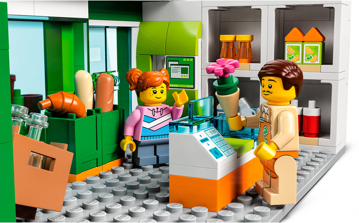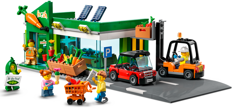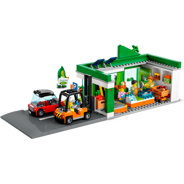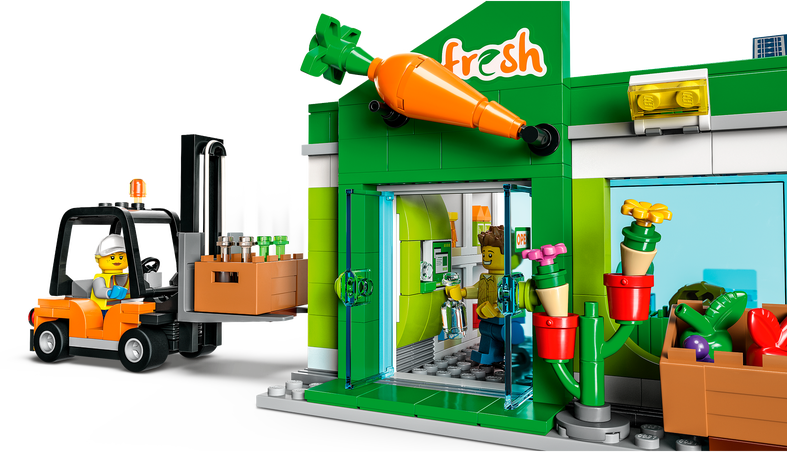 LEGO® City Ruokakauppa (60347) setti on täynnä tarvikkeita lasten kauppaleikkeihin. Leikkisupermarketin valikoimissa on monenlaisia tuotteita ja setti sisältää myös sähköauton, haarukkatrukin ja ostoskärryn. Kaupan pysäköintipaikan tierakennuslevyn voi kiinnittää muihin LEGO lelusetteihin, jolloin on luvassa aivan uudenlaisia leikkejä. Setin 5 minihahmon joukossa on muun muassa LEGO City Adventures TV-sarjasta tuttu herra Vege.