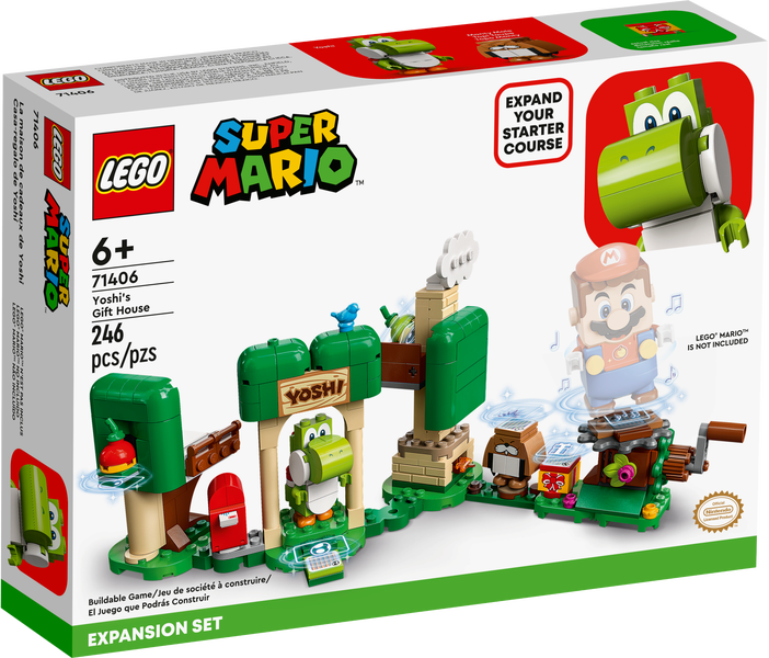 Tuotteen kuvausLapset voivat lisätä LEGO® Super Mario™ maailmaansa uuden hauskan tason Yoshin lahjatalo ‑laajennussarjalla (71406), jossa ovat mukana Yoshi ja Monty Mole. Pelaajat valloittavat tasoa ja keräävät digikolikoita interaktiivisella LEGO® Mario™, LEGO® Luigi™ tai LEGO® Peach™ hahmollaan (eivät sisälly settiin). Tervehdi Yoshia ovella, ota päiväunet sen sängyllä, poimi hedelmiä, pyöri herkkukarusellissa muuttaen hedelmät kullaksi ja ojenna ne lahjalaatikossa toiselle interaktiiviselle hahmolle. Tai anna hedelmät Yoshin kaltaiselle ystävälliselle hahmolle. (Tärkeää: Interaktiiviseen leikkiin tarvitaan aloitusrata 71360, 71387 tai 71403.)Digitaaliset rakennusohjeetKeräilylelusetti on superhieno lahja trenditietoisille, yli 6-vuotiaille lapsille. Se sopii yhtä hyvin omatoimisiin ja yhteisiin leikkeihin. Lataa LEGO Super Mario sovellus, josta löydät rakennusohjeita ja muuta hauskaa sisältöä.Uudelle tasolleLEGO Super Mario aloitusratojen ja laajennussarjojen avulla fanit voivat rakentaa, muokata ja laajentaa ikiomia tasojaan, joiden parissa kolikoita keräillään tuntikausia. Tervetuloa Yoshin lahjataloon (71406) – Tällä laajennussarjalla lapset voivat lisätä LEGO® Super Mario™ aloitusrataansa uuden tason, joka on täynnä herkkuja ja jossa on mukana myös Yoshi, eeppinen Super Mario™ hahmo 2 LEGO® Super Mario™ hahmoa – Yoshi ja Monty Mole, joiden kanssa LEGO® Mario™, LEGO® Luigi™ tai LEGO® Peach™ (huomaathan, että setti ei sisällä näitä 3 hahmoa) voivat toimia interaktiivisesti Hauskoja yksityiskohtia leikkeihin – Oviaukko, sänky, postilaatikko kirjeineen, tulisija, puu putoavine hedelmineen, punainen ja vihreä hedelmä sekä lahjalaatikko, jossa hedelmät voi antaa lahjaksi Herkkukaruselli – Pyöritä karusellissa LEGO® Mario™, LEGO® Luigi™ tai LEGO® Peach™ hahmoa, kunnes hedelmät muuttuvat kullaksi. Kerää digitaalisia bonuskolikoita ”syömällä” hedelmiä Lahjaidea yli 6-vuotiaille – 246-osainen setti sopii syntymäpäivä- tai yllätyslahjaksi kaikesta uudesta pitäville lapsille, joilla on jo leikkeihin tarvittava LEGO® Super Mario™ aloitusrata (71360, 71387 tai 71403) Rakenna aina uudelleen ja yhdistele – Setti on 12 cm korkea, 26 cm leveä ja 13 cm syvä perusmuodossaan. Moduuleista koostuvan setin voi yhdistää muihin LEGO® Super Mario™ setteihin Oheissovellus – Lataa LEGO® Super Mario™ oheissovellus, josta löytyy rakennusohjeita, hauskoja ideoita ja paljon muuta sisältöä. Yhteensopivien Android- ja iOS-laitteiden luettelon löydät osoitteesta LEGO.com/devicecheck Loputtomasti luovuutta – LEGO® Super Mario™ lelusetit soveltuvat yhteisiin ja omatoimisiin leikkeihin. Ne takaavat tuntikausiksi leikkejä, joissa metsästetään kolikoita ja ratkotaan loputtomasti luovia haasteita. Settejä voi laajentaa ja rakennella aina uudelleen Taattua laatua – LEGO® palikat ovat täyttäneet alan tiukat laatustandardit jo vuodesta 1958. Näin varmistamme, että ne kiinnittyvät aina yhtä hyvin ja tiukasti Turvallisuus on ensiarvoisen tärkeää – LEGO® osia testataan lähes kaikilla kuviteltavissa olevilla tavoilla. Näin varmistamme, että ne täyttävät tiukat kansainväliset turvallisuusstandardit