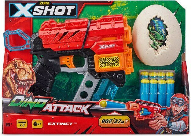Opis produktuPysäytä hurjien dinosaurusten maailmanvalloitus! Dino Extinct -ase ampuu jopa 27 metrin päähän, josta on apua, kun yrität tuhota dinosaurusten munia. Pakkaus sisältää aseen, yhden dinosauruksen munan ja kahdeksan vaahtomuoviammusta. Yli 8-vuotiaille.
