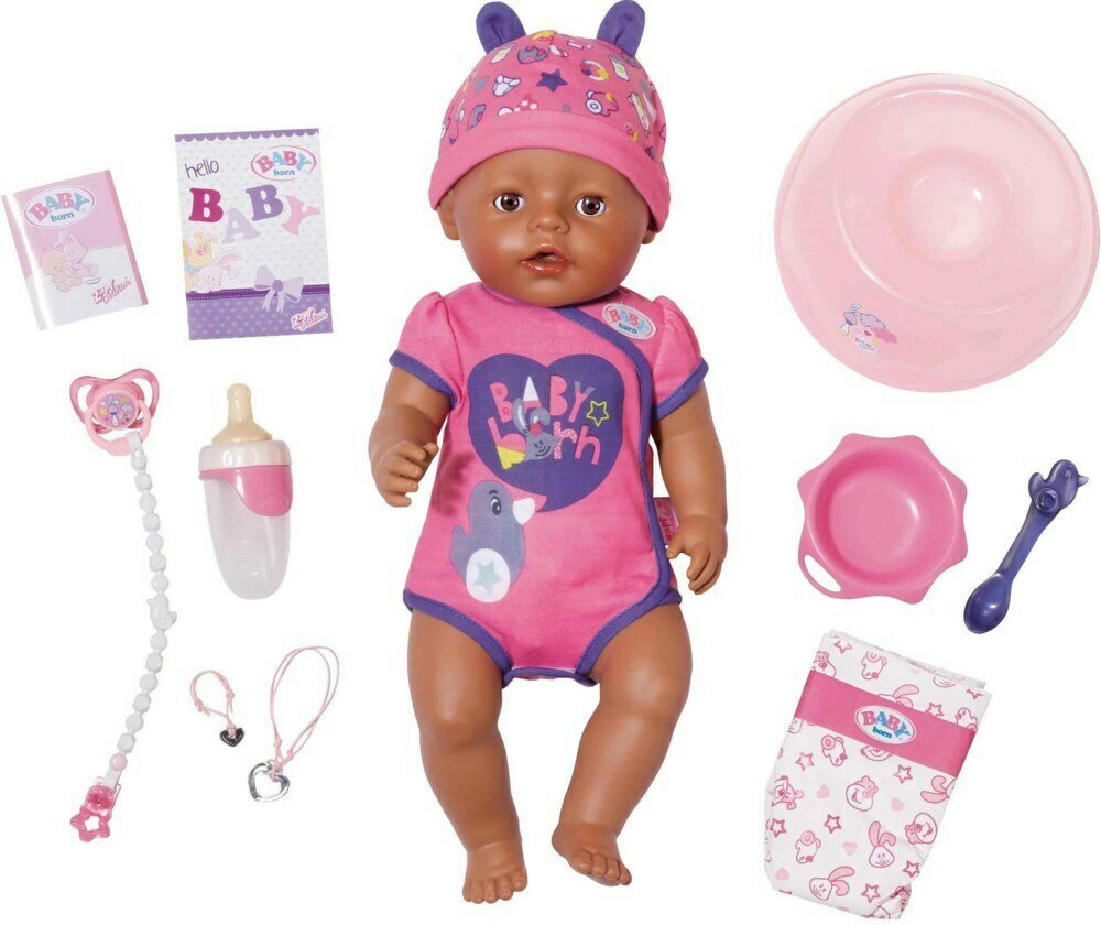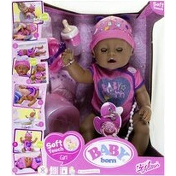 Baby Born Soft Touch ruskeasilmäinen vauvanukke. Pakkauksessa Baby Born-nukke, tutti ja tuttinauha, tuttipullo, ruokapakkaus, potta, lautanen, lusikka ja vaippa. Nukkea voi myös kylvettää. Ikäsuositus: 3+