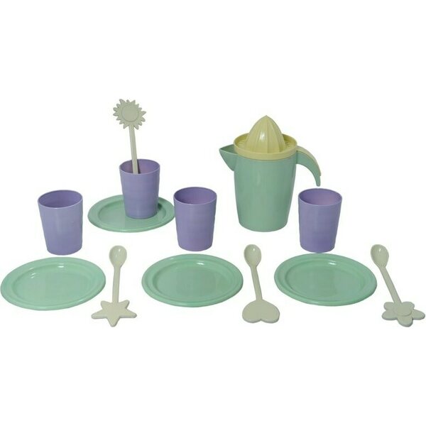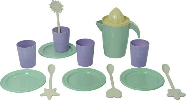 14-osainen Plasto mehuastiasto. Astiat on valmistettu sokeriruokosta, joka on 100% uusiutuvaa. 1+ vuotiaille Kestää konepesun